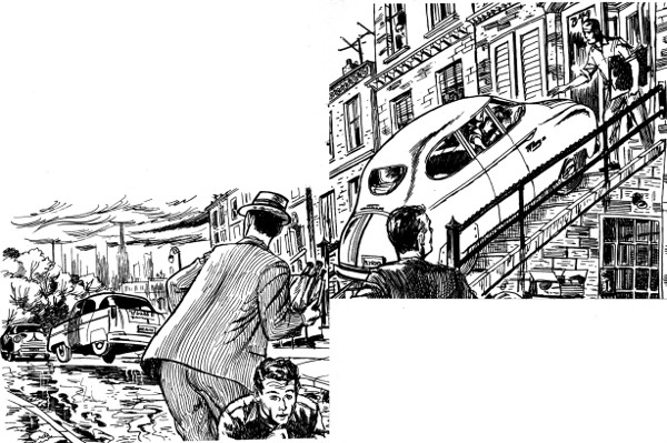 On the sidewalk, a man walking in front of Nat stooped suddenly to tie his shoe and Nat, to avoid bumping him, stepped off the curb and a taxi swerved to avoid Nat. The street was still wet and the taxi skidded, its rear end lightly flipping the front of one of those small foreign cars, which was going rather fast. It turned sideways and, without any side-slip, went right up the stoop of a brownstone opposite, coming to rest with its nose inside the front door, which a man opened at that moment.