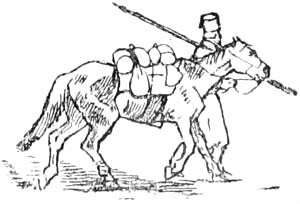 “The scarcity of fodder for the horses,” says René Bourgeois, “was appalling. Handfuls of decaying straw, the broken and trampled remnants of former bivouacs, or thatch torn from the roofs of what few huts remained, furnished all their provender, and they perished in the camp by thousands. The sheets of ice that covered the roads gave them their coup de grâce—in a short time the cavalry was a thing of the past, and dismounted horsemen swelled the ranks of the pedestrians. The regiments became hopelessly mixed up, order and discipline were no longer maintained. The soldiers took no notice of their officers, and the officers took no thought for the soldiers, every one plodded along at his own sweet will.