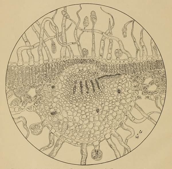 Die Holz- oder Xylemgefässe zeigen durch die eigentümlichen bandförmigen Anschwellungen die wohlbekannte Spirale, die Phloëmgefässe kennzeichnen sich durch die durchbohrten Zwischenwände oder Siebplatten; weiter treffen wir das Schwammparenchym, dass aus sehr grossen, gleichfalls chlorophyllreichen Zellen besteht, welche zahlreiche grosse Luftröhren zwischen sich einschliessen. Dann folgt wieder nach der Unterseite die Epidermis mit ihren vielen Spaltöffnungen und zu Haaren ausgewachsenen Zellen.