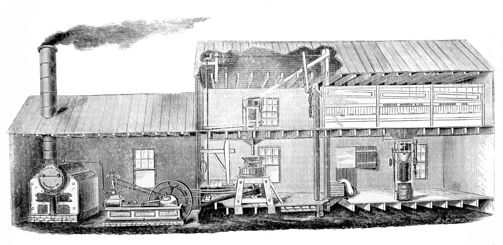 Nordyke, Marmon & Co.—Gentlemen:—The mills we purchased of you are two run, of 30-inch upper-runner pulley mills, iron back and balance, for wheat—and one under-runner 30-inch mill for grinding corn, rye, buckwheat, &c. Our power is a 20 foot boiler, 42 inches diameter, and engine 8 inch cylinder and 20 inch stroke, speed 150 revolutions per minute; speed of mills 300 revolutions. The average grinding is 7 bushels of wheat per hour to each wheat run—and of good wheat we make our customers 40 pounds of flour to the bushel after tolling—the quality, our customers say, is the best in the market. We run the three mills, two smut machines, of your make, screen and three reels with 65 pounds of steam, and use from 1½ to 2 cords of wood per day.