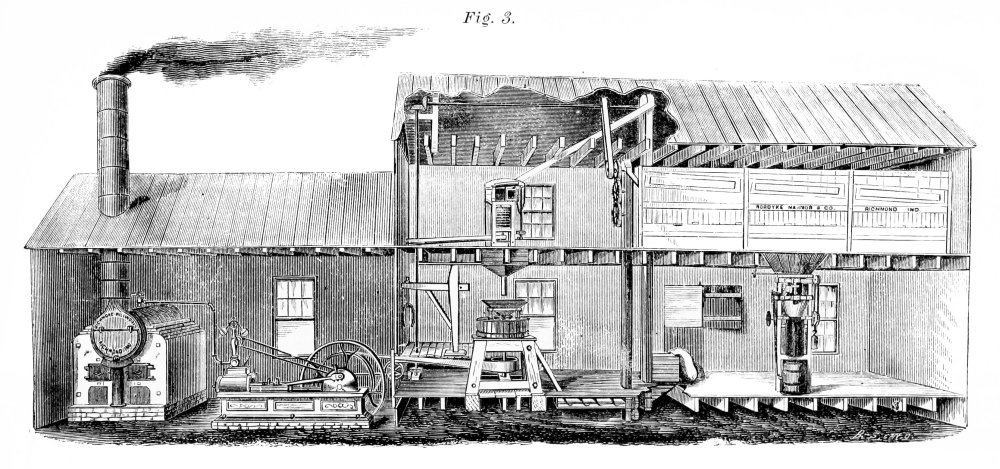 This mill is located in Montgomery County, near Crawfordsville, and composed of two run of stones, one 42 inch old quarry for wheat, and one 30 inch under runner for corn, in combined husk, also one 18 feet double reel bolt, smutter, &c. The power being a 10×20 cylinder engine, and two flue boiler 42 inches in diameter and 20 feet long.