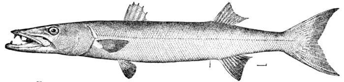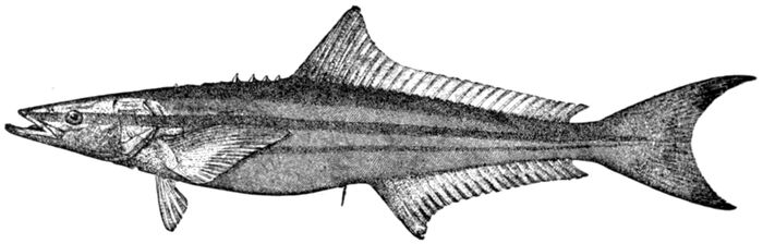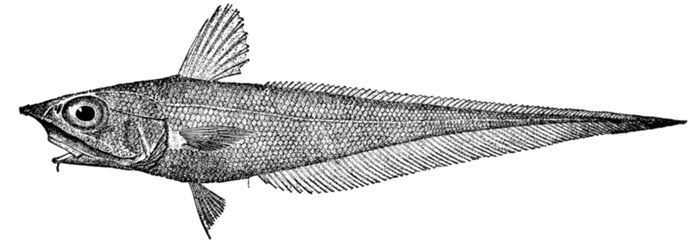 The Grenadiers: Macrouridæ.—The large family of grenadiers, or rat-tails, Macrouridæ, is confined entirely to the oceanic depths, especially of the north Atlantic and Pacific. The head is formed much as in the codfishes, with usually a barbel at the chin. There are two dorsals, the second like the anal being low, but the leptocercal tail is very long and tapering, ending in a filament 541without caudal fin. The scales are usually rough and spinous. The species are usually large in size, and dull gray or black in color.