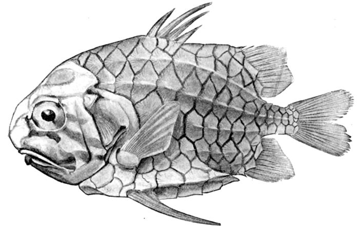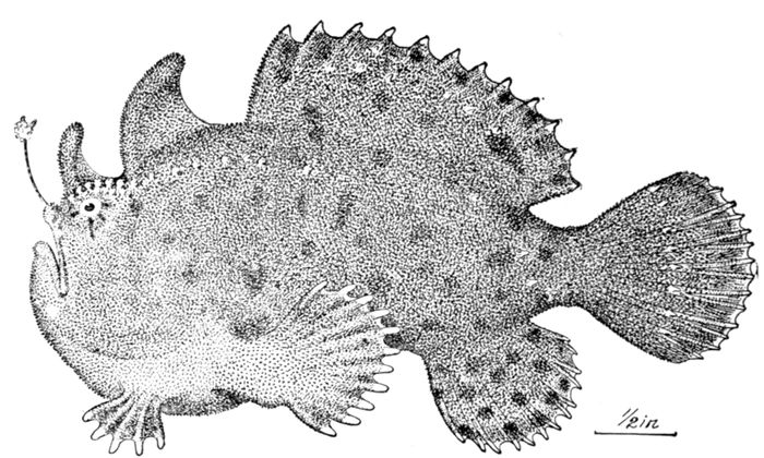 "The bathybial sea-devils are degraded forms of Lophius; they descend to the greatest depths of the ocean. Their bones are of an extremely light and thin texture, and frequently other parts of their organization, their integuments, muscles, and intestines are equally loose in texture when the specimens are brought to the surface. In their habits they probably do not differ in any degree from their surface representative, Lophius. The number of the dorsal spines is always reduced, and at the end of the series of these species only one spine remains, with a simple, very small lamella at the extremity (Melanocetus johnsonii, Melanocetus murrayi). In other forms sometimes a second cephalic spine, sometimes a spine on the back of the trunk, is preserved. The first cephalic spine always retains the original function of a lure for other marine creatures, but to render it more effective a special luminous organ is sometimes 549developed in connection with the filaments with which its extremity is provided (Ceratias bispinosus, Oneirodes eschrichtii). So far as known at present these complicated tentacles attain to the highest degree of development in Himantolophus and Ægæonichthys. In other species very peculiar dermal appendages are developed, either accompanying the spine on the back or replacing it. They may be paired or form a group of three, are pear-shaped, covered with common skin, and perforated at the top, a delicate tentacle sometimes issuing from the foramen."