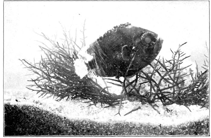 It was, in the first place, observed by Mr. Kent "that the fish while quietly reclining upon the bottom of its tank presented a most astonishing resemblance to a piece of inert rock, the rugose prominences in the neighborhood of the head lending additional strength to this likeness. This resemblance being recognized, it was next found, on a little closer inspection, that the fish constituted, in connection with its color, ornamentations, and manifold organs and appendages, the most perfect facsimile of a submerged rock, with that natural clothing of sedentary animal and vegetable growths common to boulders lying beneath the water in what is known as the laminarian zone. In this manner the numerous simple or lobulated membranous structures dependent from the lower jaw and developed as a fringe along the lateral line of the body imitate with great fidelity the little flat calcareous sponges (Grantia), small compound ascidians, and other low organized zoophytic growths that hang in profusion from favorably situated submarine stones. That famous structure known as the angler's 'rod and bait' finds its precise counterpart in the early growing phase of certain sea-plants, such as the oarweed (Laminaria), while the more posterior dorsal fin-rays, having short lateral branchlets, counterfeit in a like manner the plant-like hydroid zoophytes known as Sertulariæ. One of the most extraordinary mimetic adaptations was, however, found in connection with the eyes, structures which, however perfectly the surrounding details may be concealed, serve, as a rule, to betray the animal's presence to a close observer. In the case of the angler, the eyes during life are raised on conical elevations the sides of which are separated by darker longitudinal stripes into symmetrical regions, the structure, as a whole, with its truncated summit upon which the pupil opens, reproducing with the most wonderful minuteness the multivalve shell of a rook barnacle (Balanus). To complete the simile the entire exposed surface of the body of the fish is mapped out by darker punctated lines into irregular polygonal areas, whose pattern is at once recognized by the student of marine zoology as corresponding with that of the 545flat, cushion-like expansions of the compound tunicate Botryllus violaceus. Thus disguised at every point, the angler has merely to lie prone, as is its wont, among the stones and débris at the bottom of the sea and to wait for the advent of its unsuspecting prey, which, approaching to browse from what it takes to be a flat rock—differing in no respect from that off which it obtained the last appetizing morsel of weed or worm—finds itself suddenly engulfed beyond recall within the merciless jaws of this marine impostor."