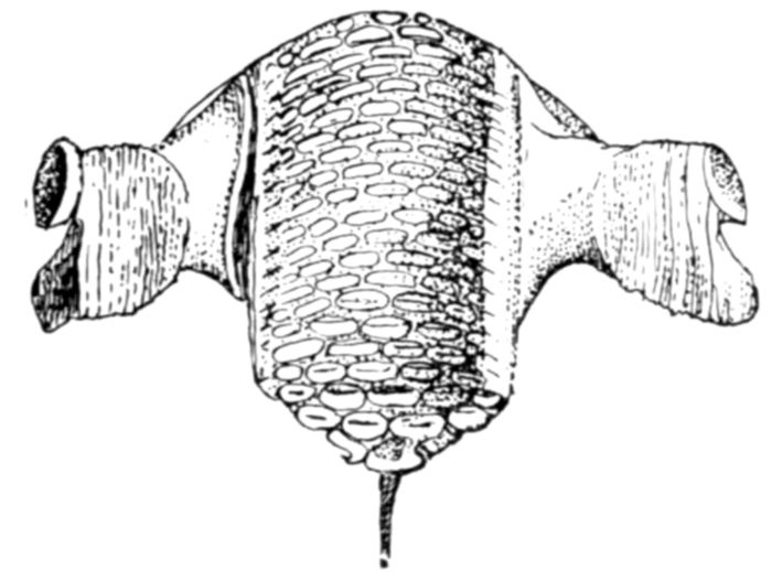 546"The angler, or goosefish, spawns in summer along the eastern Atlantic coast, and the result of its labor is quite remarkable. 'The eggs are very numerous, inclosed in a ribbon-shaped gelatinous mass, about a foot in width and thirty or forty feet long, which floats near the surface. One of these ribbons will weigh perhaps forty pounds, and is usually partially folded together and visible a foot or eighteen inches from the top of the water, its color being brownish purple. The number of eggs in one of these has been estimated to be from forty to fifty thousand.' The growth of the young after exclusion from the egg is rather rapid, and Professor Goode saw 'young fish two or three inches long' while others were yet spawning, and these young fish were presumably the fry of those that had spawned the same year, only somewhat earlier. In a few days after hatching they present a striking appearance on account of the enormous development of the pectoral and ventral fins."