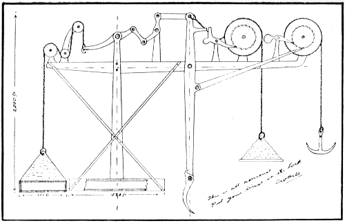 55. This referred to a large drawing of a monstrous machine which was placed in my (Jones’s) kit for the doctors to find. The machine was designed to flatten out capes, fill up bays, and uproot all islands, thereby straightening the coastline and making the sea safe for navigation. The power was to be derived from the weight of the Great Pyramid, which was to be removed from Egypt and placed on a raft 500 feet long. The raft would rise and fall with the motion of the waves, and operate an enormous knife which would cut away capes, islands, etc. One of the uses to which the machine was to be put was to slice under the island of Great Britain. We would then turn it over and start a new England on the other side!