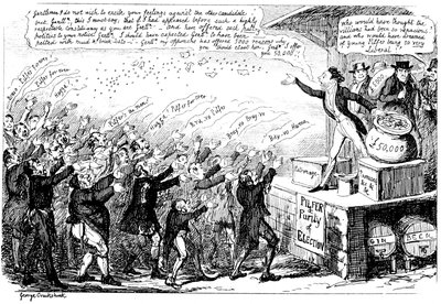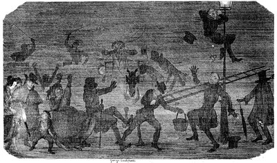 The hustings have just come to the earth with a frightful crash, the scaffolding having given way just as a poll was being loudly demanded. The confusion was, of course, dreadful. An unbending Whig fell on to the bald head of a Tory; and a stickler for the "five points," which are always in his mouth, received between his teeth the end of a walking-stick. A free-trader, who expresses openly his antipathy to anything in the shape of protection, was fortunately saved by a plank falling in a slanting direction over him; and a well-known participator in the late strike got a severe blow on both arms, which must keep the hands unemployed for a long period. The rival candidates are being looked for among the rubbish, and a man is at work with a spade, so that it may be supposed then situation is somewhat infra dig. at present. Both must have received a few plumpers, and the state of their respective polls must be rather unsatisfactory.