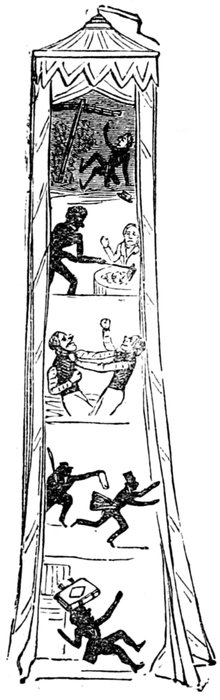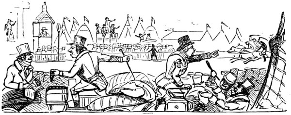 On looking at the moon, through my 500-horse power telescope, which magnifieth the planets 97,000,000 of times larger than life, I discern, that the march of intellect hath already travelled to that luminary; for I do distinctly perceive divers juveniles, of eighty years old and upwards, seated on stools, with horn-books in their hands. The Man in the Moon is also very busy, striving to metamorphose his sticks into brooms, to sweep away the cobwebs of ignorance therewith. Moreover, I do observe about half a million miles of cast-iron rail-road, in the direction of the earth, by which I do opine an inclination towards this planet. But there doth appear a great consternation amongst the other constellations, more especially in the Upper House, where Libra hath got into fiery opposition with Mars; and Saturn (who hath grown Grey) hath, in striving to part them, lost the skirts of his coat, and is glad to put up with a Spencer, whereby is clearly shadowed forth a fierce encounter between two great commanders. Let those, who think little of law and justice, read the 10,000 volumes of the Abridgment of the Statutes, and tremble!