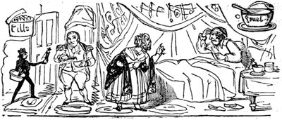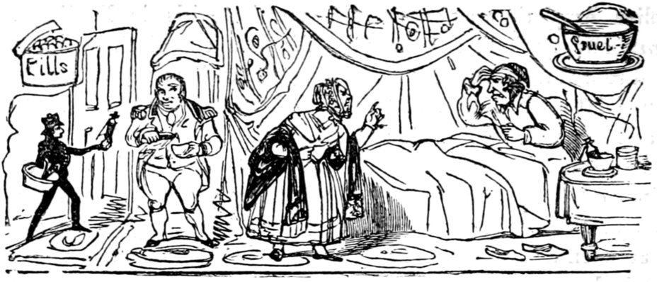 SCENE.—An Apartment in the House of Francis Moore, in which that renowned Physician and Astrologer is discovered, lying at the point of death. The Nurse is holding up his head, while a skilful Mediciner is dispensing a potion. Sundry Old Women surround his couch, in an agony of grief. The Astrologer starteth up in a paroxysm of rage.
