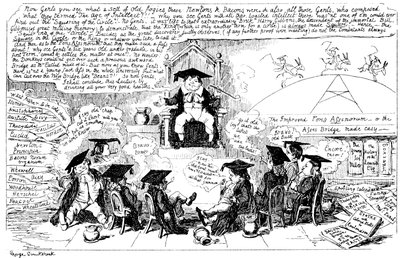 The grand aim of modern infant education is to make learning very attractive; to invest Lindley Murray with a magnetic power over the pupil's mind, and dress Dilworth in an adhesive plaster that shall cause all the little boys in the kingdom to stick to it. If Mavor's Spelling can be converted into a magic spell, there is a hope that the infant population may be charmed into an appreciation of ba, be, bi, bo, bu; and such will be the progress of education that we may have, before the expiration of a century, universities at which the wet nurse and the professor may be alike required to attend to the physical and intellectual wants of the infant students. A Bachelor of Arts will not only be entitled to the distinction of B.A., but may add the letters B.Y. to complete his description. It has already been suggested that philosophy should be taught by toys, and it will be easy to give a lecture on the laws of motion, illustrated by a game at marbles, or to explain the theory of equations by reference to the pleasing pastime of nine-pins.