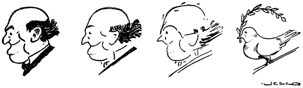 Wesentlich harmloser sind die Karikaturen, mit denen sich die Engländer selber verspotten; diese Selbstironisierung hat wenigstens etwas Versöhnendes an sich. Harrisons „Badestuhl“ (Abb. 19) ist ein Scherz auf die Zeppelinfurcht, Townsends Szene im Barbierladen ein solcher auf die Angst vor den überall eingedrungenen Deutschen (Abb. 15). Besonders die Spionenfurcht trieb in London derartige Blüten, daß auch englische Zeitungen darüber zu spotten begannen. „Evening Standard“ veröffentlichte folgenden Dialog: „Was machen Sie hier? Sie wollen doch sicherlich spionieren!“ fragt ein Schutzmann ein verdächtiges Individuum. — „Nein, ich wollte nur einbrechen!“ — „Dann entschuldigen Sie bitte!“ — — Und nachdem man in England erkannte, daß der Krieg doch kein „Gänsemarsch mit Militärmusik“ ist, wie man anfangs dachte, spotteten sogar die „Times“ über die Erfolge der Verbündeten. Auch George Morrows Geschichte von dem Kubisten ist gut, der seine bis dato unverkäuflichen Bilder „Tulpenstilleben“, „Damenporträt“ und „Frühlingssang“ nun als „Zerstörung von Löwen“, „Ruinen der Reimser Kathedrale“ und „Die Hunnen“ spielend absetzt. Viel des Interessanten enthält der „Punch-Almanack“ auf 1915. In Anlehnung an die jedem englischen Kinde geläufigen „Mother Goose’s Nursery Rhymes“ mit ihrem ganz eigenartigen Rhythmus, der das Einprägen dieser Verse so spielend leicht macht, werden die politischen Ereignisse vorgeführt. Da ist eine Serie „When William comes to London“. Dann erhalten die englischen Parlamentarier, die nicht bedingungslos für den Krieg stimmten, besondere Auszeichnungen: Ramsay das Eiserne Kreuz, Hardie als Keir von Hardie den Nobelpreis (erstaunt blickt auf diesem Bilde der kaiserliche Dackel die ihm ganz ungewohnte zerknüllte Hose des Arbeiterführers an). Hardie hatte seinen Landsleuten vorgeworfen, sie hätten eine Lügenfabrik errichtet, von der auf Bestellung deutsche Greueltaten geliefert würden. Auch das politische Alphabet fehlt nicht (Abb. 16, 17, 18); R eine Verspottung der Russen, die nicht in Frankreich landen konnten. Und eine Nachdichtung auf das berühmte „Mary had a little lamb“ ist da, nur heißt sie „Willie had a little Wolff“ (das offizielle Telegraphenbureau). Dieser „Punch-Almanack“ hält sich von allem ausgesprochen Rohen frei; er wird als ein amüsantes zeitgeschichtliches Dokument (das natürlich von Engländern und für Engländer verfaßt ist) auch in späteren Zeiten oft genannt werden.