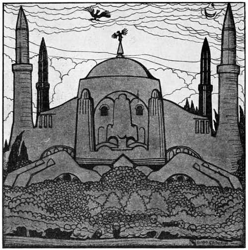 Das bereits erwähnte neue satirische Wochenblatt „Il Numero“ steht, wie schon gesagt, künstlerisch wesentlich höher. Eine ganze Reihe geschickter Zeichner arbeiten dafür. Die Nummern, die zehn Centesimi kosten, haben oft einheitlichen, geschlossenen Inhalt; so wendet sich beispielsweise ein Heft gegen die Schweiz, die angeblich ihre Neutralität in allzu deutschfreundlichem Sinne ausgenutzt hat. Auch der 42 cm-Mörser spielt in diesem Blatte eine große Rolle, wie in der Zeichnung „Der Gleichmacher“ von Nirsoli (Abb. 36). Cadorin zeichnet die kommende Hagia Sofia in Konstantinopel (Abb. 91). Ein anderer Künstler, Scarpelli (scarpe = Schuhe; daher die Signatur links unten) zeigt den deutschen Kaiser, wie er das durch die Neutralität „gefesselte“ Italien mit der Türkei schreckte (Abb. 93). Zu den zahlreichen Blättern gegen den österreichischen Kaiser gehört eine Zeichnung von Nasika „La Bocca del Cattaro“, ein Ausdruck der Freude über die Beschießung dieses süddalmatinischen Hafens durch die französische Marine, die ja übrigens recht trostlos verlief und an jenen berühmten „Sieg“ der Franzosen bei der Beschießung des Leuchtturmes Pelagosa erinnert; damals bestand die Beute aus den Unterhosen des Leuchtturmwächters, zwei alten Hennen, dreißig jungen Hühnern, zwei Tauben, einer Ziege, einem Kanarienvogel und einem halben Hektoliter Wein, die alle von den französischen Matrosen mitgeschleppt wurden. — Daß auch die italienischen Zeitungen den Krieg in Gestalt von Karikaturen verarbeiten, zeigt Abbildung 110; auch in dieser kurz vor Eintritt Italiens in den Krieg erschienenen Zeichnung kommt bereits die deutschfeindliche Tendenz zum beredten Ausdruck.