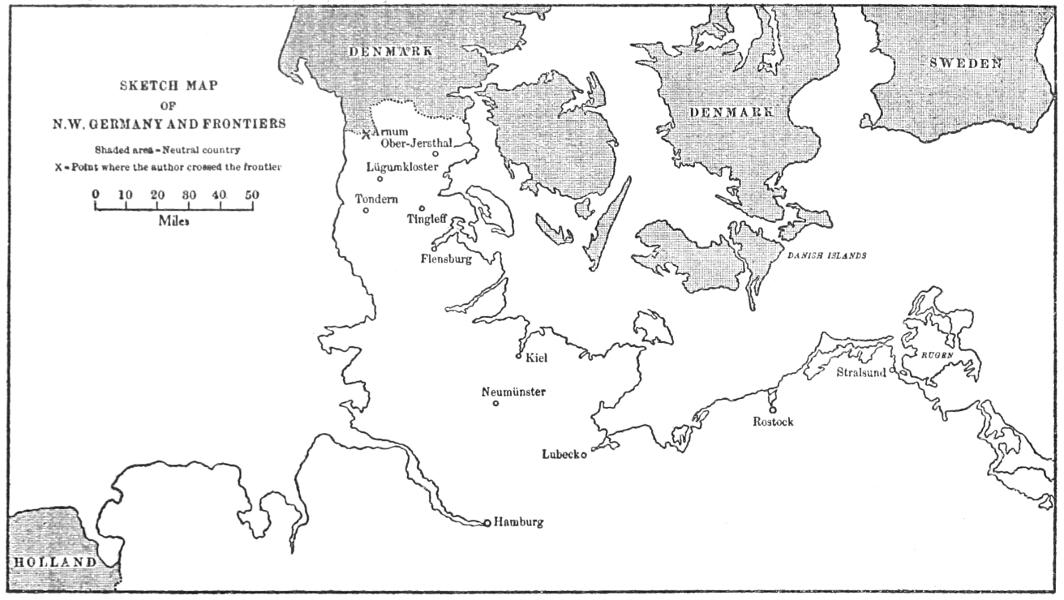 I booked direct to Flensburg—about four marks’ worth—and made my way downstairs to the departure platform, which was indicated clearly enough. I did not like the odd quarter of an hour which I had to wait before the train came in. I was not very happy about my dark blue waterproof. I could not see anything approaching its counterpart. If one stands still, one can be examined at leisure; if one moves up and down, one runs the gauntlet of a hundred restless eyes, any one pair of which may at some previous date have had first hand cognisance of a typical naval rubber-lined English waterproof....