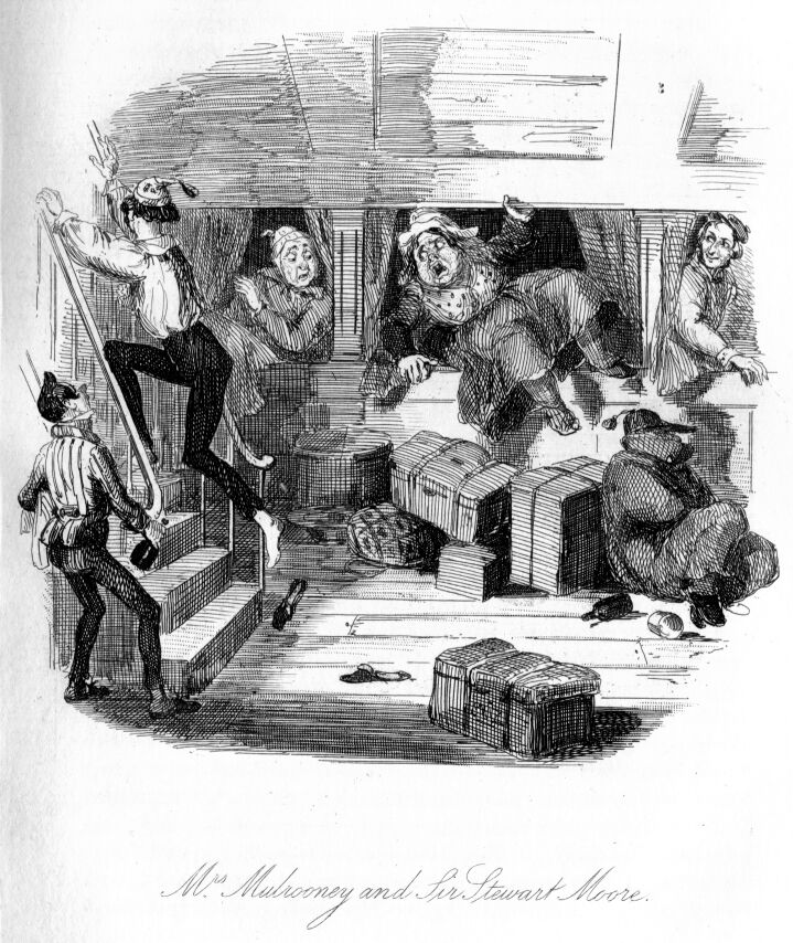 These words being accompanied by a certain indication of change of residence on the part of Mrs. Mulrooney, Sir Stewart perceived there was no time to lose, and springing from his berth, he rushed half-dressed through the cabin, and up the companion-ladder, just as Mrs. Mulrooney had protruded a pair of enormous legs from her couch, and hung for a moment pendulous before she dropped upon the floor, and followed him to the deck. A tremendous shout of laughter from the sailors and deck passengers prevented my hearing the dialogue which ensued; nor do I yet know how Mrs. Mulrooney learned her mistake. Certain it is, she no more appeared among the passengers in the cabin, and Sir Stewart's manner the following morning at breakfast amply satisfied me that I had had my revenge.