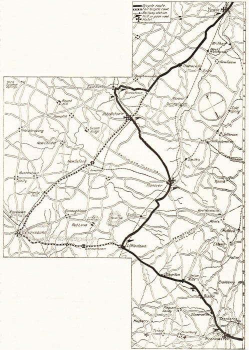 On leaving York, to continue the journey to Washington by the route which we are going, the rider turns south and westward on what is known as the York and Gettysburg Turnpike. The road is direct to Thomasville, about six miles away, with the exception of three forks. These should be carefully watched, and the rider should in his inquiries always ask for the York and Gettysburg Turnpike. The first fork is something less than a mile out from York, a few minutes after crossing the railroad track. Here the rider should keep to the left. He again takes the left fork a short two miles further on, and about a mile or more before reaching Thomasville, at the junction of three roads, he keeps to the right on the turnpike. From Thomasville to Hockstown, a distance of about three miles, the turnpike is unmistakable. By referring to the map at Hockstown, the reader will see that the main route turns sharp to the right, running over to East Berlin, a distance of three or three and a half miles. It is possible to follow the turnpike to Gettysburg as indicated on the map by the fair bicycle road, but the route to East Berlin is much better. From East Berlin run on to Abbottstown. At this point the rider must make up his mind whether he will make a detour of some miles and take in the field of Gettysburg. If there is time enough, you are earnestly urged to make the extra run, since there is much at Gettysburg which is interesting to the student of American history. Leaving Abbottstown, run out to New Oxford on the York and Gettysburg Turnpike. The road is unmistakable, and from this point to Gettysburg, through Granite Hill, the turnpike is most of the time near the railroad, so that it is easy to follow it. Gettysburg will be a good place for dinner; it is more than half-way to Westminster, and an hour or two can be very profitably spent in the vicinity of the town in seeing what there is to be seen. From Gettysburg follow the route to Germantown, and thence to Littlestown. At Littlestown the rider again joins the main bicycle route from York to Westminster, and proceeds thence into Westminster.