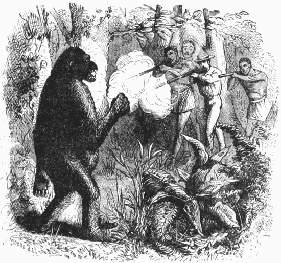 While I stood here, up came two of my hunters, and began to laugh at me. "Look, Chaillie," said they, calling me by the name I am known by among them—"look at your friend. Every time we kill gorilla, you tell us look at your black friend, your first cousin. Now, you see, look at your white friend." Then came a roar of laughter at what they thought a tremendous joke.