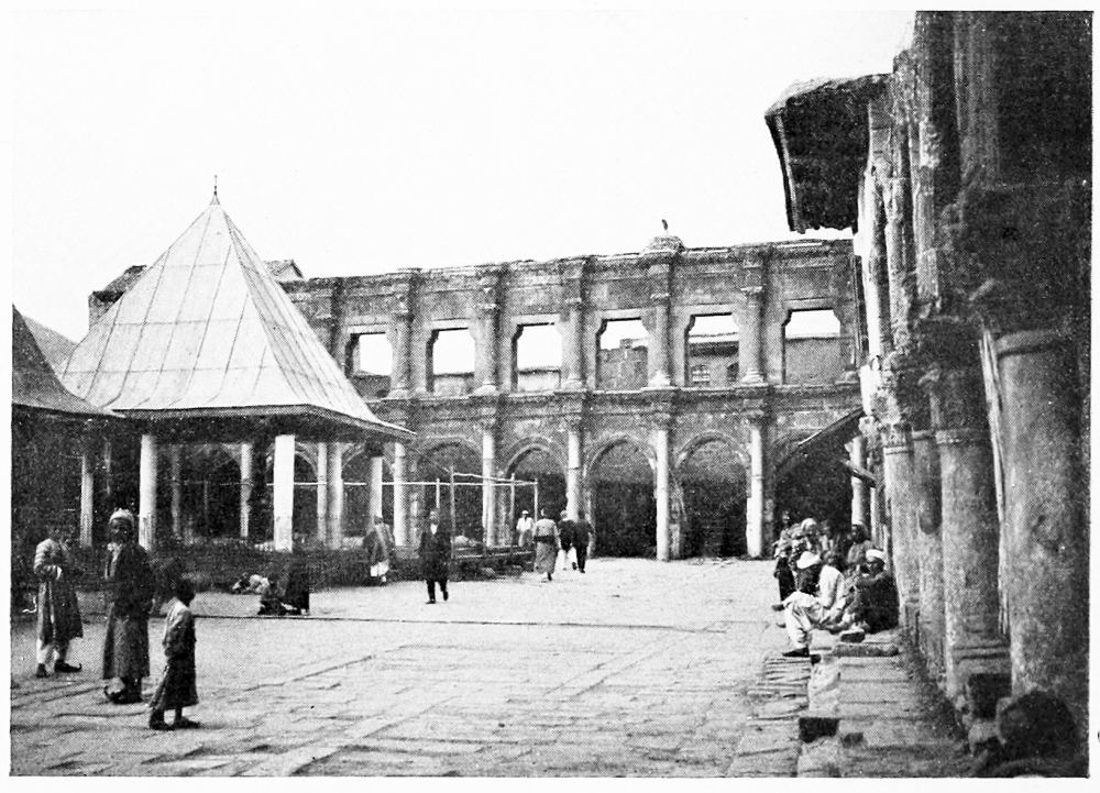 We passed on our return the tekîyeh of Abu Bekr, a beautiful Mamlûk shrine with cypresses in its courtyard, which lift their black spires proudly over that treeless land. The brother of the hereditary sheikh showed me the mosque; it contains an exquisite miḥrâb of laced stone work, and windows that are protected by carved wooden shutters and filled with old coloured glass. Near the mosque is the square hall of a bath, now fallen into disrepair. Four pendentives convert the square into an octagon, and eight more hold the circle of the dome—as fine a piece of massive construction as you would wish to see. The sheikh and his family occupied some small adjoining rooms, and the young wife of my guide made me welcome with smiles and lemon sherbet. From the deep embrasure of her window I looked out upon Aleppo citadel and congratulated her upon her secluded house set in the thickness of ancient walls.