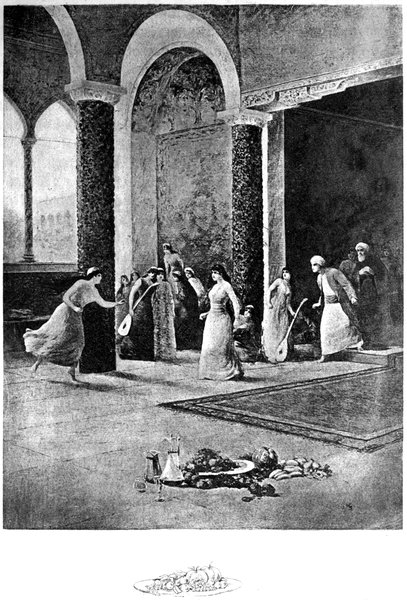After bathing they left; and, when the Overseer heard that they had gone to the Hammam, he sat down to await the twain, and presently they came up to him like two gazelles; their cheeks were reddened by the bath and their eyes were darker than ever; their faces shone and they were as two lustrous moons or two branches fruit-laden. Now when he saw them he rose forthright and said to them, "O my sons, may your bath profit you alway!"[19] Whereupon Taj al-Muluk replied, with the sweetest of speech, "Allah be bountiful to thee, O my father; why didst thou not come with us and bathe in our company?" Then they both bent over his right hand and kissed it and walked before him to the shop, to entreat him honourably and show their respect for him, for that he was Chief of the Merchants and the market, and he had done them kindness in giving them the shop. When he saw their hips 18quivering as they moved, desire and longing redoubled on him; and he puffed and snorted and he devoured them with his eyes, for he could not contain himself, repeating the while these two couplets:—
