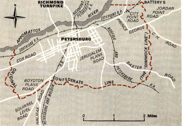 It was the railroads more than the highways, however, which gave to Petersburg a significance out of all proportion to its size. Tracks radiated from the city in all directions. The Richmond and Petersburg Railroad left the city to the north; the Southside Railroad ran west to Lynchburg; the Petersburg and Weldon Railroad led south to North Carolina; the Norfolk and Petersburg Railroad passed through a ravine east of the city before turning southeast toward Norfolk; and the Petersburg and City Point Railroad struck out for the hamlet of City Point, situated at the junction of the James and Appomattox Rivers about 8 miles away.