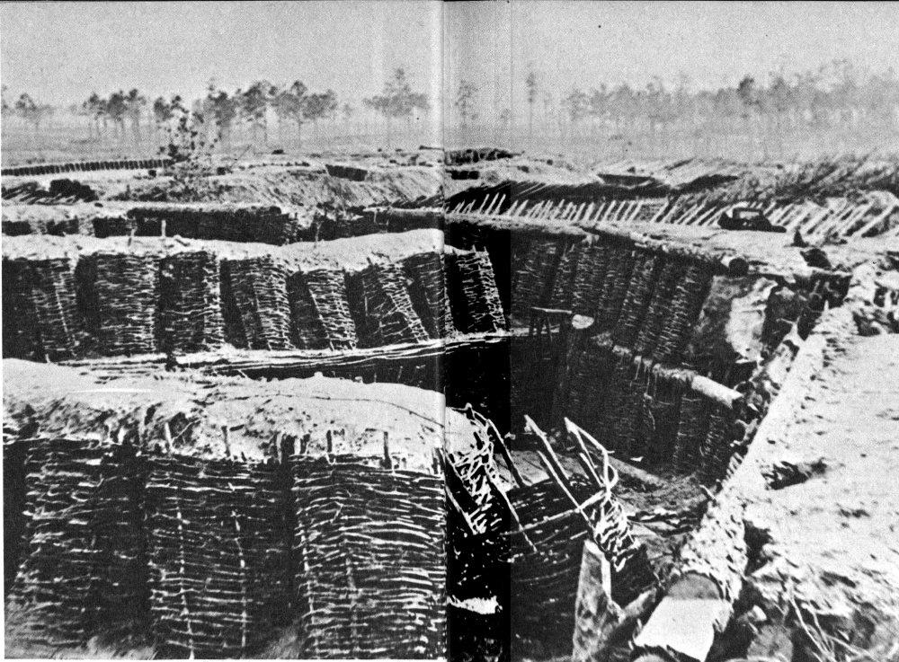 A section of the Confederate defense lines around Petersburg. Note the use of wickerware (gabions), sharpened stakes (fraises), and branches (abatis) to protect the position.