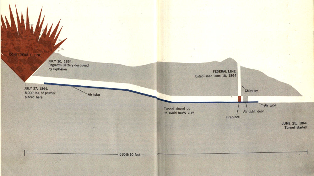 Cross-section view of the Federal tunnel under the Confederate line. Colonel Pleasants later recalled that “General Burnside told me that General Meade and Major Duane, chief engineer of the Army of the Potomac, said the thing could not be done—that it was all clap-trap and nonsense; that such a length of mine had never been excavated in military operations, and could not be; that I would either get the men smothered, for want of air, or crushed by the falling of the earth; or the enemy would find it out and it would amount to nothing.”