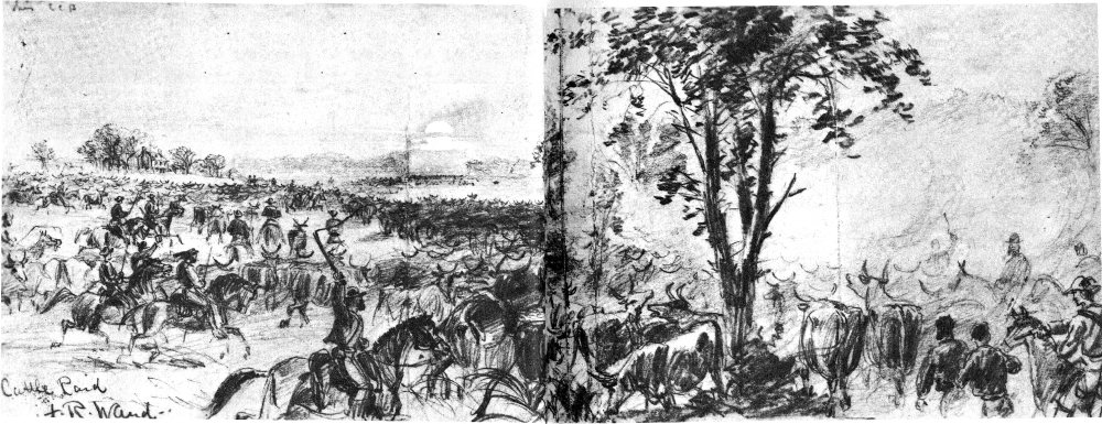 Petersburg’s hungry defenders were delighted when Maj. Gen. Wade Hampton’s Confederate horsemen rustled more than 2,000 cattle from the Union army in September 1864. Alfred Waud sketched the raid for Harper’s Weekly.