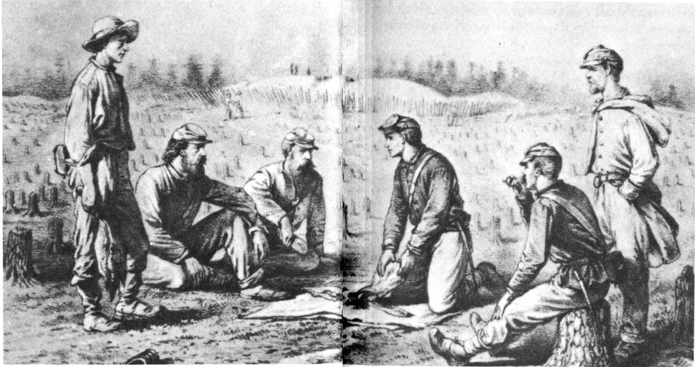 The men of both sides had much in common, despite the bitterness with which they fought. In battle they were enemies, but in camp they were on the same common level. Stripped of the emotional tension and exhilaration of combat they all appear as bored, war-weary, homesick men. The greater part of their time was primarily utilized by digging and constructing fortifications, performing sentry and picket duty, and striving to speed up the long succession of days. They lived in rude improvised shelters, often made of mud and log walls with tent roofs. Chimneys were made of mud and barrels. There was some friendly interchange of words and gifts between the lines, but enmity was more rampant than brotherly regard. Off duty, the amusements and pastimes of the soldiers were simple and few—limited in most cases to their ability to improvise them. The most striking difference between the armies as the Petersburg campaign lengthened was that, while the Northerners suffered most from boredom, the Confederates were plagued by the demoralizing effects of hunger.