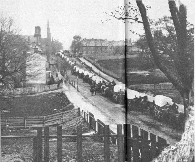 On April 3, 1865, with Petersburg in Union hands at last, General Grant issued orders sending off the Armies of the Potomac and the James in pursuit of Lee. While the photographer was taking this picture, showing a Federal wagon train leaving the city to join in the chase, the remnants of Lee’s army were marching toward a little crossroad village named Appomattox Court House.