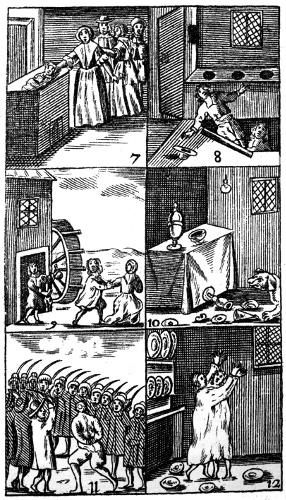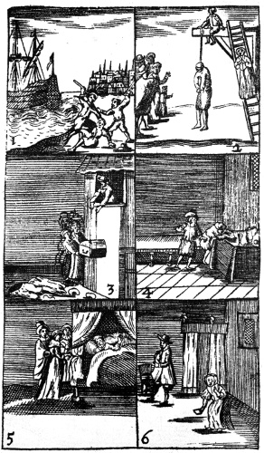 The Old man seeing that his Locks and Keys would not keep his money secure, found out other inventions to hide it, which he did in ordinary unsuspected places, as among the Sea-coals, or in some hole of the House or Garden. But the 275Son one time met with a purse of ten pound; and that being too much to be spent in one day, he staid out a whole week; his Mother was now distracted as before, for his absence, but the father soon missing his money, and believing that his Son had met with it, was satisfied that he would stay abroad till it was spent, and so he did; for at the weeks end he came home as confidently, as if he had done no harm. Although his Mother, out of joy for the return of her Prodigal, was well enough satisfied with his theft, yet the Old man once more was resolved to correct him: and therefore getting him up into a Garret, locked him up till such time as he might prepare himself for the Correction he intended. This young Extravagant being thus incarcerated, set his wits at work how to get out; at length he found a Gutter-window, and saw that he might get out to the top of the House; this he resolved to do, but withal he intended once again to put his Mother to the fright; and thereupon searching the Garret, he found all sorts of materials and utensils fit for his design; he first took an old Doublet and Breeches, and stuffed them full of rags, straw, and such rubbish as he could find, and then he took shooes and stockings and stuffed the stockings full of bran; and making somewhat like a head, he put his hat on it; and putting the Coat he wore over all this, he put a rope about the neck of this Scare-crow, and so hanged it on one of the beams in the Garret; when he had put his matters in this order, he sat down, and being well pleased at his own invention, laughed as heartily now as he knew his Mother would cry when she came to see it; and having thus bestowed this Scar-crow, 276he got out to the top of the house, and sat there perdue, expecting the event.