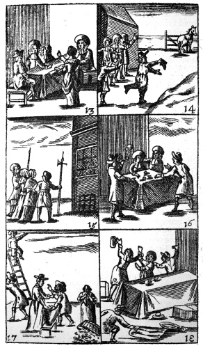 By this discourse you may judge of his inclination, and his Mother now refusing him money, he would purloyn a silver Spoon or some other piece of plate, and convert it into Pocket mettle, and being once furnished with money he would go seek out Company. Those that had any grace or honesty would refuse to accompany him, and therefore he got into the company of such Bulkers and Pick pockets as he had known whilst he was in the Counter, and now he employed his industry in contriving ways with them to get a purchase, and being one day at a Milliners or Haberdashers shop, who was related to him, he asked the Master to lend him half a piece, he refused him the money, but gave him very good counsel, if he had had the grace to receive it, and make use of it as he ought. But it was to as little purpose to speak to him at that rate, as it had been to endeavor to wash the Black-more white, both labour in vain, and our Extravagant was so angry at his friend for it; that he told him that he might have found somewhat else to do, and since he had not, he would ere long find him some other imployment, somewhat else to talk about, and so left him; and now being resolved what to do, he went and found out some of his forementioned acquaintance, Bulkers or House-breakers, and telling them he had a great desire to assist them in robbing of the Milliners shop, which he told them was very well furnished with good ready Mony, Commodities, Silk and Silk ribboning, Gloves and such like wares, they liked the design well enough, and now they asked him the place where, but here appeared 314a very great obstacle; for this Milliners shop was in such a place as was very difficult to be robb’d, it being the very next door to the Watch-house, where the Constable and watch generally sat. This they told him would be dangerous to attempt; but he affirming the more danger the more honour,and that he was resolved it should be done, and he knew how to do it handsomely if they would be ruled by him; they promised their assistance to the execution of this design. It was necessary there should be five or six persons, wherefore they making up that company, and he being one of that number, and all things provided according to his order and directions, about ten of the Clock at night they set forwards. They divided themselves into two parts or companies and our Extravagant and two others that went into an Ale-house at some small distance from the Watch house. There they called for drink, and soon began their work, which was to quarrel with one another, they were armed with swords, then they drew and began a scuffle, one of the three runs up to the Watch, and cries out Murther, Murther; The Constable hearing the noise, and doubting there might be sufficient cause, took all his Watch-men to attend Him, but he found no great trouble to appease this quarrel, which being ended, he with his Watch returned to his Rendezvous: In this time the other three had not been idle, but so soon as ever the Constables back was turned, they broke open the Shop Door they intended to rob, and it was not very difficult so to do, for it was not so strongly barricado’d, as otherwise it might have been, because of the safety the owner thought he was in, by reason of the Constables sitting there.