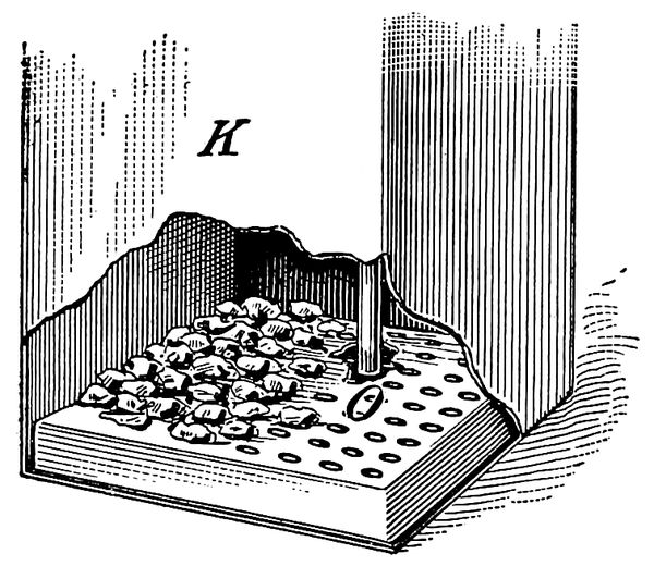 It is necessary to have a false perforated bottom in the gas chamber to rest the zinc upon and also to keep it above the solution. To make and support this bottom take a piece of sheet lead 14 inches square, as shown in Fig. 8, and form it in the shape of a pan, which will drop easily into the gas chamber k, Fig. 8½. A piece of 1½ or 2 inch lead pipe, 2 inches long, n, should be burned on the center 36of the false bottom, to prevent the center from sagging with the weight of zinc. Then punch the bottom O, Fig. 8, full of ¼-inch holes. A 1½-inch hole, y, should also be cut in line with the holes for the acid supply pipe.