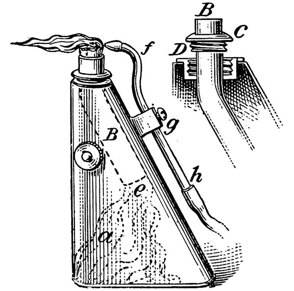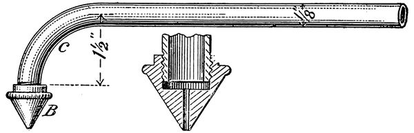 A screw and cap with a seat, such as is used on brass lamps, is obtained, and a hole punched in the cap c just large enough to receive the tube B. The screw is soldered into the opening of the can at D. The wick, which is formed of many strands of candle wicking rolled tightly together, is pulled through the tube by means of a wire hook, and left sufficiently long to lie in the space a, so that it will always lie in the alcohol. This tube is placed through the hole at D, and allowed to project about ¾ inch outside of the can. Wicking is then wound around the tube and forced into the socket formed in the screw D. The cap is then slipped over the tube at c, and screwed down tight on the wicking, which will make a 136tight joint at D, and will hold the tube firmly in place.