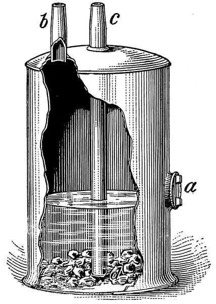 The requirements of a hydrogen generator for lead burning are that it should be safe, economical 16and automatic in its action. It must be so constructed that it will generate gas enough to keep the supply constant, and deliver it at sufficient pressure to keep the flame steady. It must also be provided with a combination fire trap and scrubbing cup. This will prevent the explosion of the generator by firing the gas in the hose. This trap must be partly filled with a solution of blue vitriol to act as a precipitation cup. (This is treated under the head of “Scrubbing Cup.”)