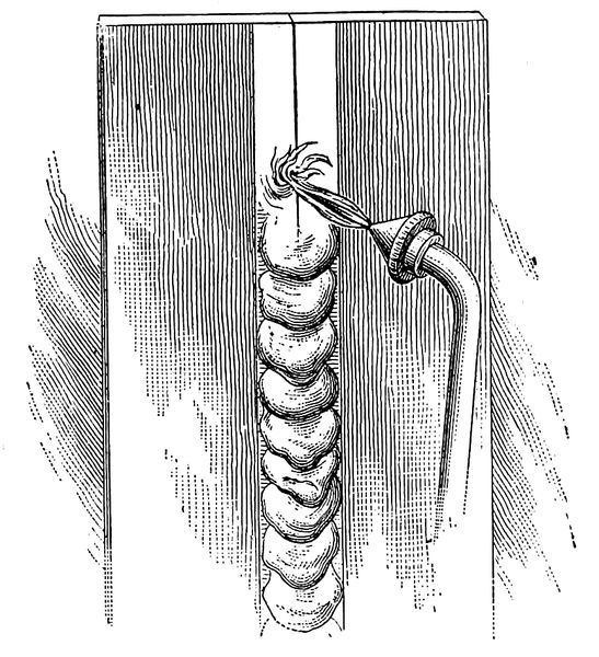 The commercial zinc is known as spelter and is sold in pigs or blocks, which are easily broken into fragments, like stove coal, with a heavy hammer. 21The commercial sulphuric acid is known as oil of vitriol and is sold by the pound. The acid cannot be employed in its pure state, but must be reduced with water in the proportion of one part of acid to seven parts of warm water. They must be mixed by adding the acid slowly to the water; never the water to the acid. The combination of acid and water enters at once into reaction and always generates heat, and the result of adding water to acid would be small explosions. There would be danger of the acid flying on one's clothes or into the eyes. The mixture should never be stronger than six parts of water to one of acid.