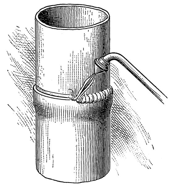 The common blow pipe is a simple little tool that is used in connection with an alcohol torch for soldering the finest and most delicate pieces of jewelry, and constitutes the sole method of soldering used by Britannia workers and jewelers, and the fact that such a varied assortment of articles are soldered by the blow pipe process leads one to surmise that it can be used to advantage on coarser work. Though it is a familiar tool to gas fitters, plumbers as a rule are ignorant of its use, and it is hard work to find one who ever saw a blow pipe used on lead work. It is an easy matter to become proficient in its use, and the trick of keeping up a steady blast, and breathing regularly at the same time, is soon learned, and, when once acquired, stays with you always. This trick consists of making a bellows of your cheeks and using your tongue as a valve to close the entrance to the throat, leaving the passage from the nostrils to the lungs clear for breathing purposes. The only things necessary 128to purchase for practice are a common bent blow pipe, which can be had for about 15 cents, and a common candle.