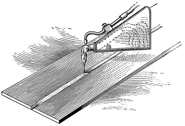 The under sheet should brighten at once, and the force of the flame, being partially directed 96against the melted drop, tends to force it against the bright spot on the back sheet, with which it instantly unites. The flame must then be withdrawn for an instant, to give the fused drop time to set. The operation must be repeated until the seam is finished. Using ordinary language, it may be said that the drop is cut from the upper sheet, carried slightly downward and then stuck against the back sheet by the force of the flame.