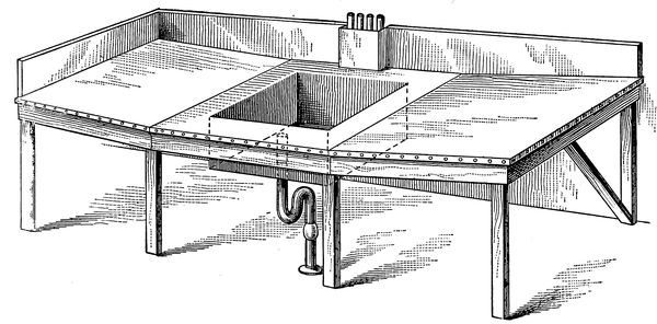 The most common argument put forth by manufacturers is that the bottoms of lead lined tanks are soon cut out, owing to dropping sharp pieces of metal into them. This difficulty can be best overcome by placing a slatted bottom of wood in the tank, holding the same in place with strips of sheet lead, one end of which has been previously burned to the bottom of the tank. These strips are to be brought up through the slats and then bent over the top of them. This will keep the wood from floating, and is the only practical way to do it, as the false bottoms soon decay, and can be easily removed and replaced by simply bending back the strips of lead.