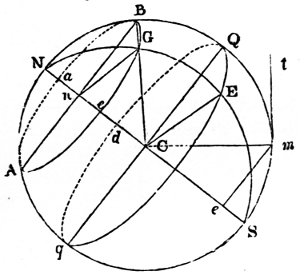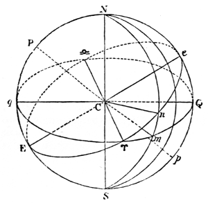 The mean distance of a planet from the sun is equal to half the major axis (N. 42) of its orbit: if, therefore, the planet described a circle (N. 43) round the sun at its mean distance, the motion would be uniform, and the periodic time unaltered, because the planet would arrive at the extremities of the major axis at the same instant, and would have the same velocity, whether it moved in the circular or elliptical orbit, since the curves coincide in these points. But in every other part the elliptical, or true motion (N. 44), would either be faster or 9slower than the circular or mean motion (N. 45). As it is necessary to have some fixed point in the heavens from whence to estimate these motions, the vernal equinox (N. 46) at a given epoch has been chosen. The equinoctial, which is a great circle traced in the starry heavens by the imaginary extension of the plane of the terrestrial equator, is intersected by the ecliptic, or apparent path of the sun, in two points diametrically opposite to one another, called the vernal and autumnal equinoxes. The vernal equinox is the point through which the sun passes in going from the southern to the northern hemisphere; and the autumnal, that in which he crosses from the northern to the southern. The mean or circular motion of a body, estimated from the vernal equinox, is its mean longitude; and its elliptical, or true motion, reckoned from that point, is its true longitude (N. 47): both being estimated from west to east, the direction in which the bodies move. The difference between the two is called the equation of the centre (N. 48); which consequently vanishes at the apsides (N. 49), or extremities of the major axis, and is at its maximum ninety degrees (N. 50) distant from these points, or in quadratures (N. 51), where it measures the excentricity (N. 52) of the orbit; so that the place of the planet in its elliptical orbit is obtained by adding or subtracting the equation of the centre to or from its mean longitude.