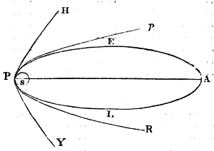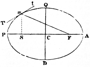 A planet moves in its elliptical orbit with a velocity varying every instant, in consequence of two forces, one tending to the centre of the sun, and the other in the direction of a tangent (N. 38) to its orbit, arising from the primitive impulse given at the time when it was launched into space. Should the force in the tangent cease, the planet would fall to the sun by its gravity. Were the sun not to attract it, the planet would fly off in the tangent. Thus, when the planet is at the point of its orbit farthest from the sun, his action overcomes the planet’s velocity, and brings it towards him with such an accelerated motion, that at last it overcomes the sun’s attraction, and, shooting past him, gradually decreases in velocity until it arrives at the most distant point, where the sun’s attraction again prevails (N. 39). In this motion the radii vectores (N. 40), or imaginary lines joining the centres of the sun and the planets, pass over equal areas or spaces in equal times (N. 41).