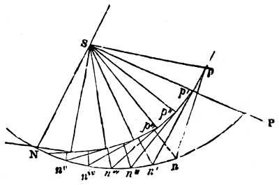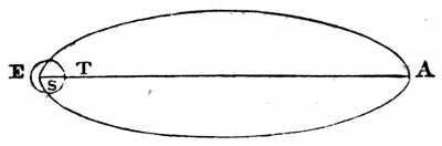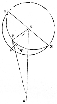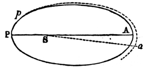 The radial force, or that part of the disturbing force which acts in the direction of the line joining the centres of the sun and disturbed planet, has no effect on the areas, but is the cause of periodical changes of small extent in the distance of the planet from the sun. It has already been shown, that the force producing 16perfectly elliptical motion varies inversely as the square of the distance, and that a force following any other law would cause the body to move in a curve of a very different kind. Now, the radial disturbing force varies directly as the distance; and, as it sometimes combines with and increases the intensity of the sun’s attraction for the disturbed body, and at other times opposes and consequently diminishes it, in both cases it causes the sun’s attraction to deviate from the exact law of gravity, and the whole action of this compound central force on the disturbed body is either greater or less than what is requisite for perfectly elliptical motion. When greater, the curvature of the disturbed planet’s path, on leaving its perihelion (N. 64), or point nearest the sun, is greater than it would be in the ellipse, which brings the planet to its aphelion (N. 65), or point farthest from the sun, before it has passed through 180°, as it would do if undisturbed. So that in this case the apsides, or extremities of the major axis, advance in space. When the central force is less than the law of gravity requires, the curvature of the planet’s path is less than the curvature of the ellipse. So that the planet, on leaving its perihelion, would pass through more than 180° before arriving at its aphelion, which causes the apsides to recede in space (N. 66). Cases both of advance and recess occur during a revolution of the two planets; but those in which the apsides advance preponderate. This, however, is not the full amount of the motion of the apsides; part arises also from the tangential force (N. 63), which alternately accelerates and retards the velocity of the disturbed planet. An increase in the planet’s tangential velocity diminishes the curvature of its orbit, and is equivalent to a decrease of central force. On the contrary, a decrease of the tangential velocity, which increases the curvature of the orbit, is equivalent to an increase of central force. These fluctuations, owing to the tangential force, occasion an alternate recess and advance of the apsides, after the manner already explained (N. 66). An uncompensated portion of the direct motion, arising from this cause, conspires with that already impressed by the radial force, and in some cases even nearly doubles the direct motion of these points. The motion of the apsides may be represented by supposing a planet to move in an ellipse, while the ellipse itself is slowly revolving about the sun in the same plane (N. 67). This motion of the major axis, 17which is direct in all the orbits except that of the planet Venus, is irregular, and so slow that it requires more than 109,830 years for the major axis of the earth’s orbit to accomplish a sidereal revolution (N. 68), that is, to return to the same stars; and 20,984 years to complete its tropical revolution (N. 69), or to return to the same equinox. The difference between these two periods arises from a retrograde motion in the equinoctial point, which meets the advancing axis before it has completed its revolution with regard to the stars. The major axis of Jupiter’s orbit requires no less than 200,610 years to perform its sidereal revolution, and 22,748 years to accomplish its tropical revolution from the disturbing action of Saturn alone.