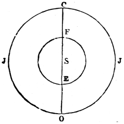 Newton also ascertained that a body projected (N. 20) in space (N. 21) will move in a conic section (N. 22), if attracted by a force proceeding from a fixed point, with an intensity inversely as the square of the distance (N. 23); but that any deviation from that law will cause it to move in a curve of a different nature. Kepler found, by direct observation, that the planets describe ellipses (N. 24), or oval paths, round the sun. Later observations show that comets also move in conic sections. It consequently follows that the sun attracts all the planets and comets inversely as the square of their distances from its centre; the sun, therefore, is the centre of a force extending indefinitely in space, and including all the bodies of the system in its action.