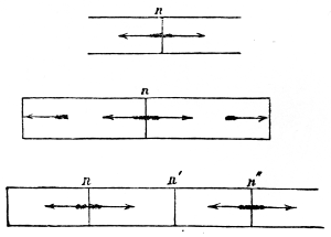 If a sphere at rest in space receive an impulse passing through its centre of gravity, all its parts will move with an equal velocity in a straight line; but, if the impulse does not pass through the centre of gravity, its particles, having unequal velocities, will have a rotatory or revolving motion, at the same time that it is translated (N. 36) in space. These motions are independent of one another; so that a contrary impulse, passing through its centre of gravity, will impede its progress, without interfering with its rotation. The sun rotates about an axis, and modern observations show that an impulse in a contrary direction has not been given to his centre of gravity, for he moves in space, accompanied by all those bodies which compose the solar system—a circumstance which in no way interferes with their relative motions; for, in consequence of the principle that force is proportional to velocity (N. 37), the reciprocal attractions of a system remain the same whether its centre of gravity be at rest, or moving uniformly in space. It is computed that, had the earth received its motion from a single impulse, that impulse must have passed through a point about twenty-five miles from its centre.