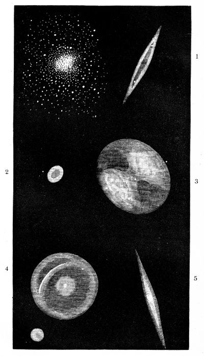 The Fixed Stars—Their Number—The Milky Way—Double Stars—Binary Systems—Their Orbits and Periodic Times—Colours of the Stars—Stars that have vanished—Variable Stars—Variation in Sun’s Light—Parallax and Distances of the Fixed Stars—Masses of the Stars—Comparative Light of the Stars—Proper Motions of the Stars—Apparent Motions of the Stars—Motion and Velocity of the Sun and Solar System—The Nebulæ—Their Number—Catalogue of them—Consist of Two Classes—Diffuse Nebulæ—Definitely formed Nebulæ—Globular Clusters—Splendour of Milky Way—Distribution of the Nebulæ—The Magellanic Clouds—Nebulæ round η Argûs—Constitution of Nebulæ, and the Forces that maintain them—Meteorites and Shooting Stars