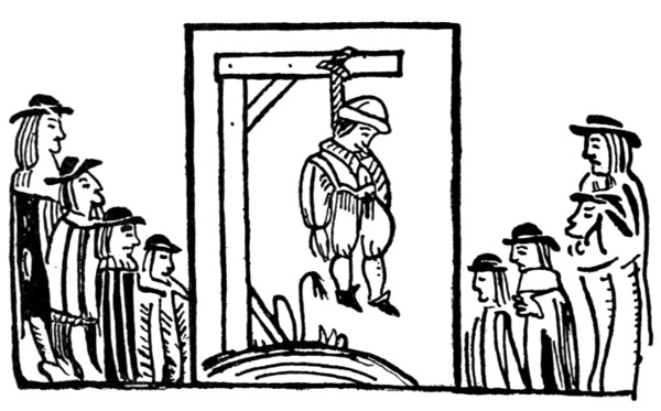 "Having o'ermastered them you set upon, do you carry them into some covert, where you search so severely that nothing can be hidden from you. If in this strict enquiry, gold be found privily quilted in a doublet, or in the waistband of his breeches, I can hardly forbear smiling when I think in what manner the rogues will rate the poor man with 'villain,' or 'cheating rascal,' for endeavouring to preserve his own, whilst he has [Pg 379] nothing else to say but that he is 'undone,' which they regard as little as the hangman will them at the place of execution. Having then changed your horse for theirs, if better than your own, the next thing to do is to make them swear neither to follow you, nor to raise the country with a hue-and-cry upon you. Thus, leaving the poor traveller forlorn, you ride to some strange place, or else where you are known and winked at, and there you share that which you unlawfully have got, not without cheating one another.