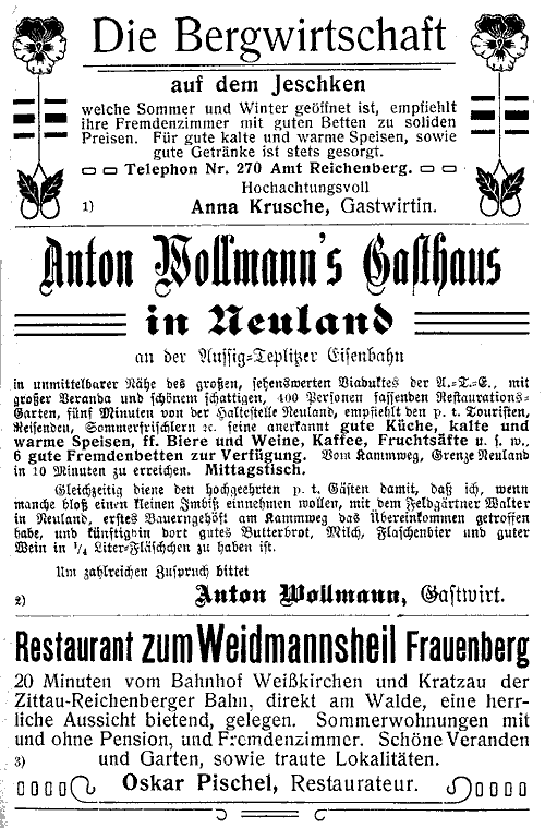 Die im Bogen westlich vom Sattel – zugleich Hauptwasserscheide zwischen Oder und Elbe (Eckersbach und Jeschkenbach) – abwärts führende Bezirksstraße hat in 8 Min. Entfernung, nach Überquerung der Bahn, Miesler's Gasthaus an seiner r. Seite, ein einschichtig knapp unterhalb der Station Kriesdorf an der Gabelung der Bezirks- und Bahnhofstraße gelegenes, großes Gebäude, das zu dem[14] eine halbe Stunde entfernten, weit über 300 Häuser zählenden, alten Kirch- und Bauerndorfe Kriesdorf gehört, woselbst am 1. Sept. 1813 zwischen Polen und Österreichern ein Scharmützel stattfand; das Chor der Kirche und eine Glocke stammen noch aus spätgothischer Zeit. Station und Gasthaus sind sehr gelegen für Jene, welche die Tour ganz oder nur der Einkehr halber unterbrechen wollen.