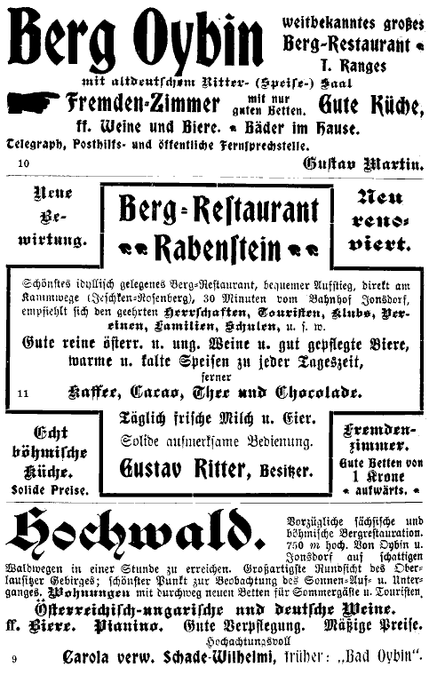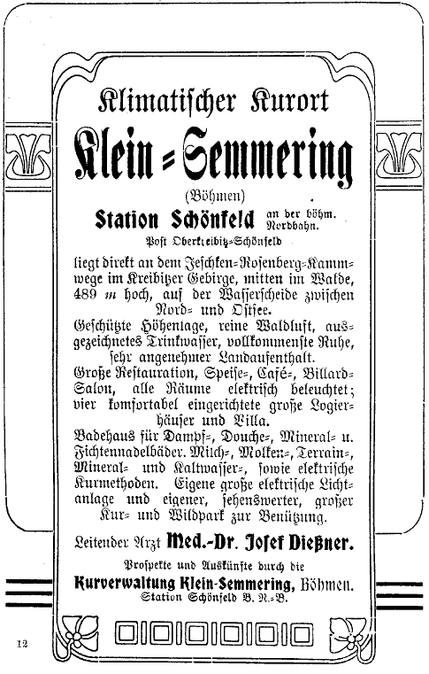 Erforderlichenfalls kann man hier zur Station Schönbach-Seifersdorf nördlich beim Marktflecken Schönbach hinabsteigen. Der prächtig zur Sommerfrische geeignete Ort hat über 180 Häuser, die sich längs des Schönbaches bis knapp an den Gebirgskamm heraufziehen, eine 1725 erbaute Kirche mit einer wundertätigen Madonnenstatue aus dem 17. Jahrh., und einen 1766 zur Erinnerung an den damaligen Aufenthalt Kaiser Josef II. im Hofe des Gasthauses Nr. 47 errichteten Gedenkstein.