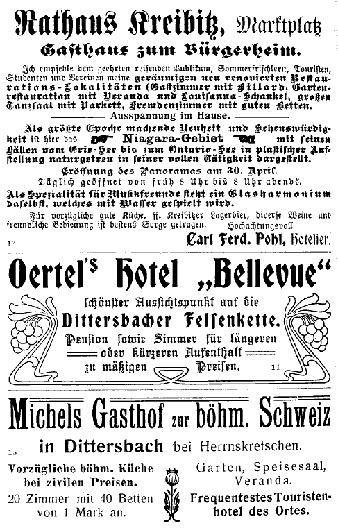 Oben beim Dittersbacher Grieselkreuz gibt es Wegweiser in den Gerstgrund, über die Hinschke zu den Eisengruben und ins Scholzental, sowie nach Dittersbach. Letzteres Pfarrdorf, das auf ein hohes Alter zurückblickt, gegenwärtig 110 Häuser zählt, vom Bielebache und der Herrnskretschen-Kreibitzer Straße durchzogen wird, ist Sitz einer Gebirgsvereinssektion mit Studentenherberge und seit vielen Jahrzehnten eine besuchte Sommerfrische, sowie ein Hauptknotenpunkt der böhmischen Schweiz. Es liegt 15 Min., das aussichtsreiche Hotel Bellevue nur 10 Min. entfernt, so daß ein Abstecher dahin nicht zu viel Zeit in Anspruch nimmt. Dasselbe gilt vom Donsberge, einer 323 m hohen Basaltkuppe, nahe vor uns geradeaus an der Straße; er ist seit 1883 vom Gebirgsverein auf Spazierwegen zugänglich gemacht und gewährt von der 1885 errichteten Aussichtsgallerie einen hübschen Blick auf Dittersbach und seine vielbesuchten, merkwürdigen Felsgebilde (Falkenstein, Marienfelsen, Wilhelminenwand, Rudolfstein, Katzenkirche), die es umkränzen.