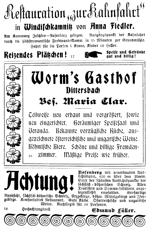Unser weiterer Weg wendet sich bei dem genannten Gasthause r. zwischen den Häusern am Mühlbache, der zur Linken bleibt, entlang, den Rosenberg vorn, den Ottenberg im Rücken. Nach 8 Min. sind wir beim letzten Hause von Schemmel, in weiteren 7 Min. – eine Stunde von der Grieselmühle – zwischen Mühlbach und felsenbesäumter Waldlehne, beim ersten Hause von Nieder-Windischkamnitz, einer Brettmühle; das alte und große Pfarrdorf Windischkamnitz (200 Häuser) zieht sich zur Linken, in gleicher Seehöhe wie Schemmel, am Kamnitzbache und an der Bezirksstraße in einem felsenbesäumten Wiesentale 45 Min. lang hin, von wo dann durch das angrenzende Jonsbach einerseits B. Kamnitz in 1 Stunde, andererseits die Bahnstation Rabstein in 30 Min. zu erreichen ist; eine Abteilung des Gebirgsvereines für die böhmische Schweiz nebst Studentenherberge befindet sich daselbst.