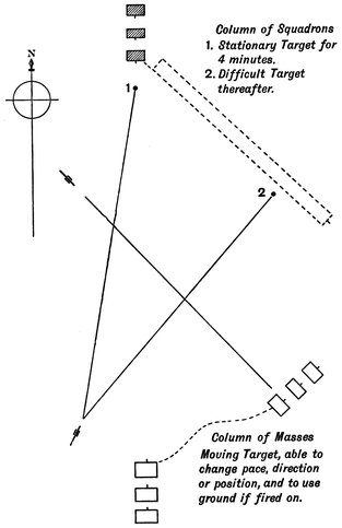 31 This is still more applicable in the fight of the cavalry division, since two horse artillery brigades in action occupy a front of 475 yards, and once the guns are in position the direction in which this front faces can only be altered to any appreciable extent by limbering up.