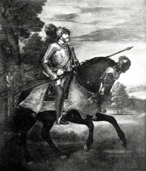 This portrait by Titian represents the Emperor at the battle of Muhlberg (1546), where, an historian says, "he looked a warrior; he rode an Andalusian horse covered with a crimson silk cloth with a gold fringe. His armour was brilliant, the helmet and cuirass garnished with gold. He wore the red sash with golden stripes of the general of the house of Burgundy."